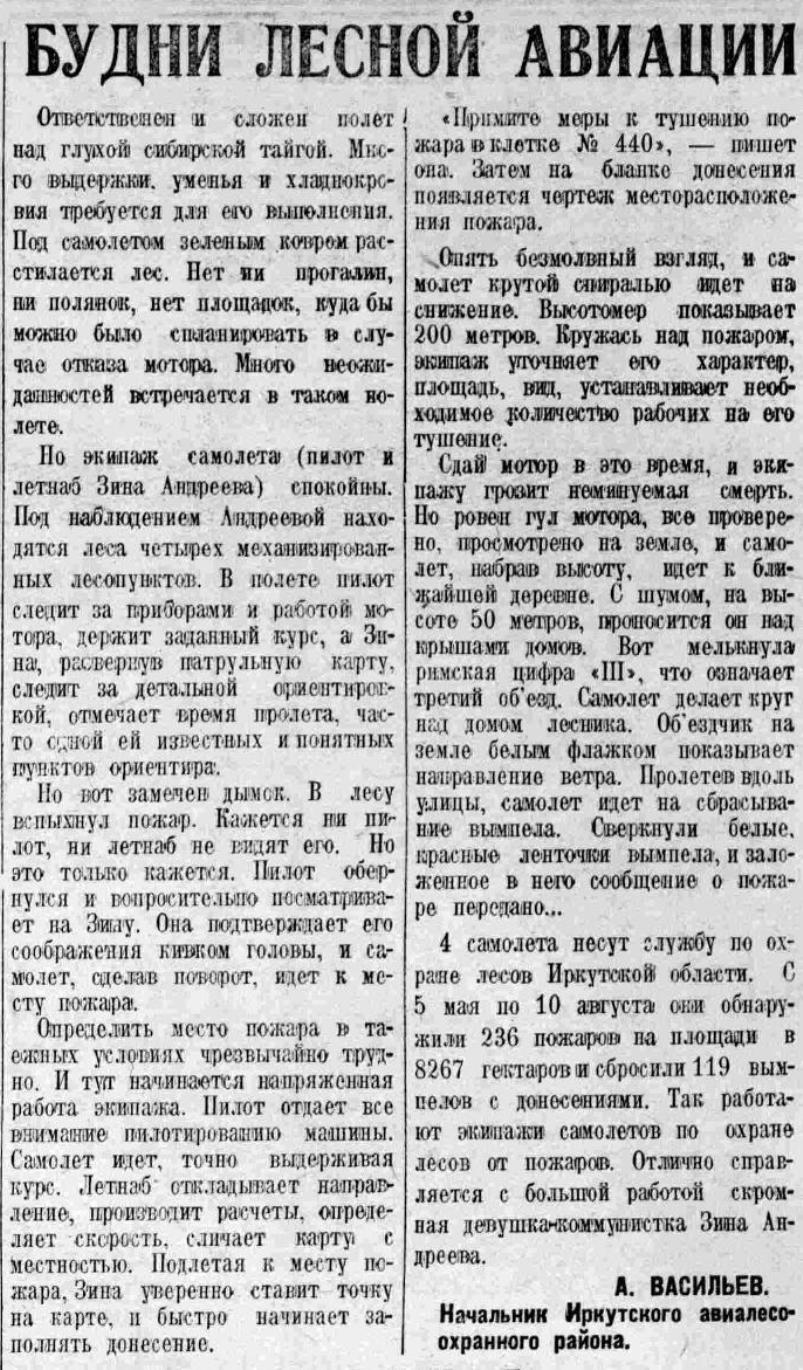4 самолета несут службу по охране лесов Иркутской области. С 5 мая по 10 августа они обнаружили 236 пожаров на площади в 8267 гектаров и сбросили 119 вымпелов с донесениями. Так работают экипажи самолетов по охране лесов от пожаров. Отлично справляется с большой работой скромная девушка-коммунистка Зина Андреева.