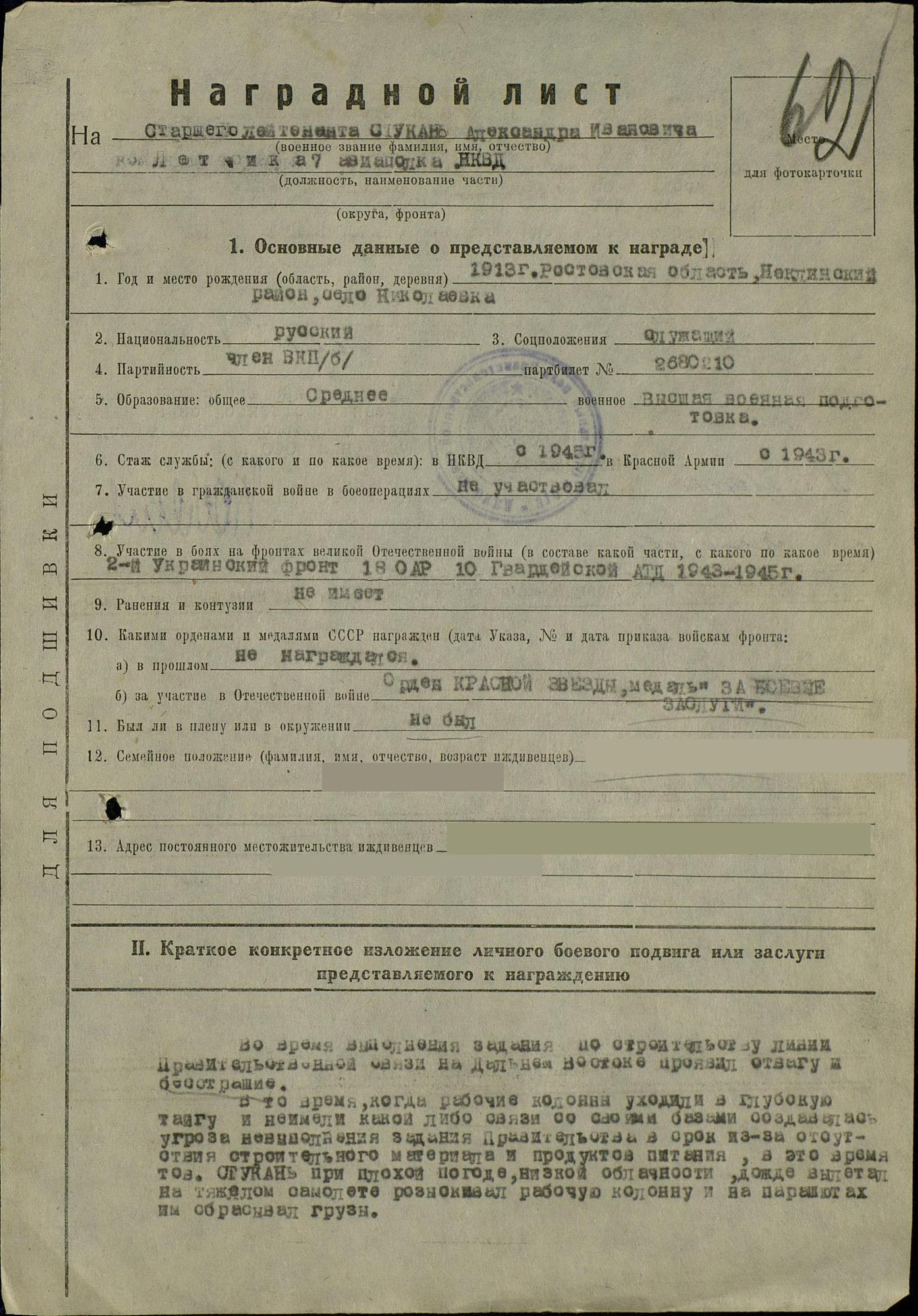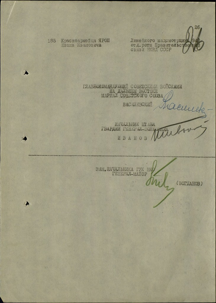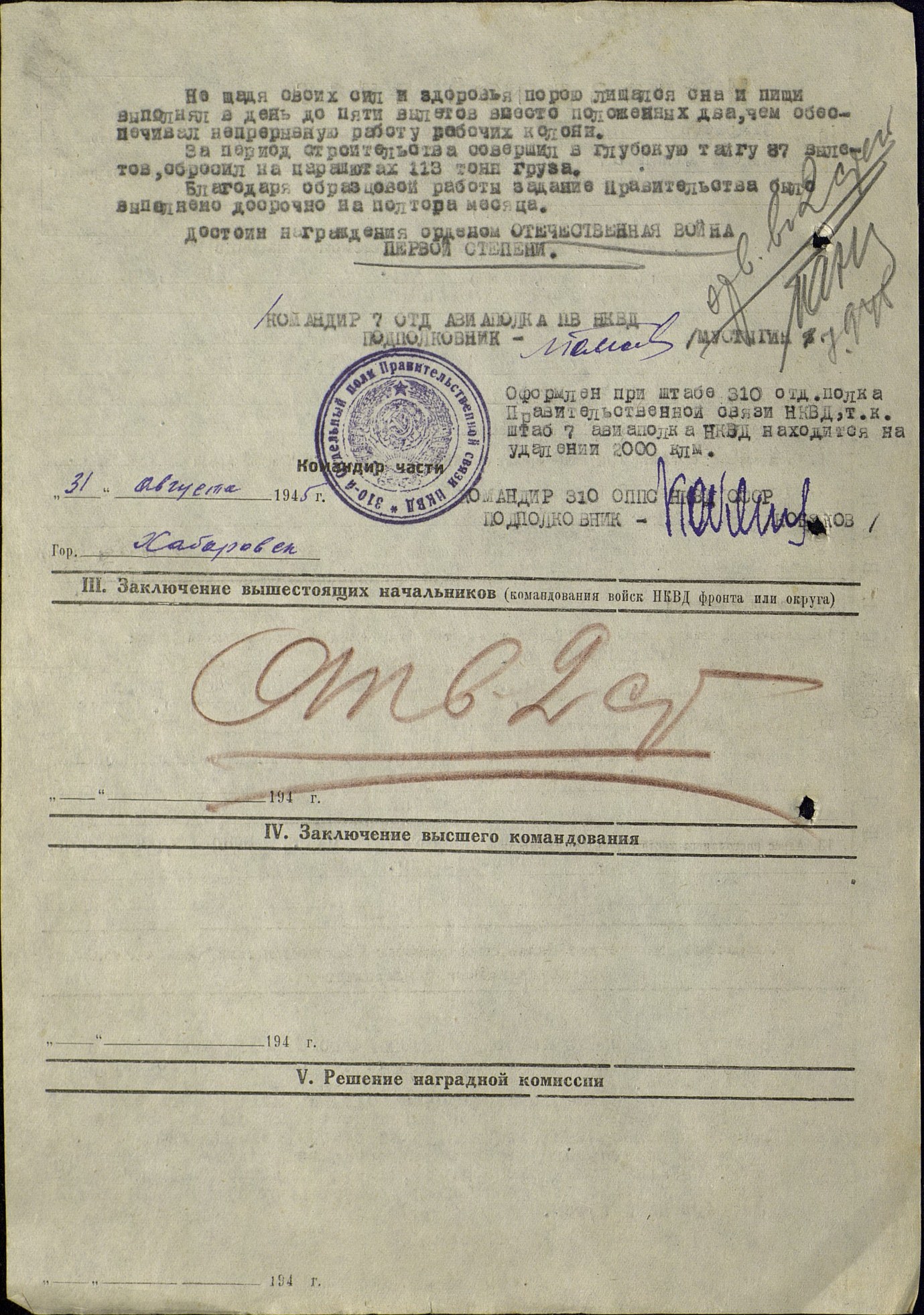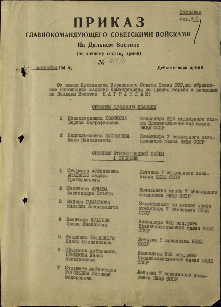 Я участвовал в подготовке наступления на Японию. В 45-м году 22 апреля нас перевели в Хабаровск, и там мы выполняли соответствующие задания командования. За это меня и весь экипаж наградили орденом Отечественной войны II степени.