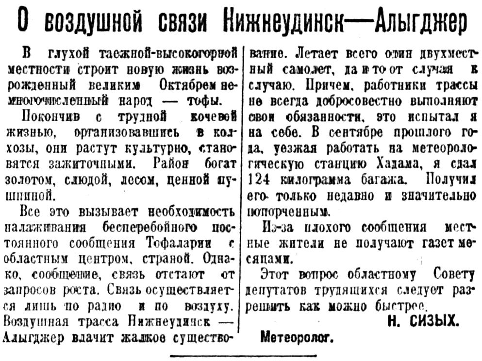 Все это вызывает необходимость налаживания бесперебойного постоянного сообщения Тофаларии с областным центром, страной. Однако, сообщение, связь отстают от запросов роста. Связь осуществляется лишь по радио и по воздуху. Воздушная трасса Нижнеудинск — Алыгджер влачит жалкое существование. Летает всего один двухместный самолет, да и то от случая к случаю. Причем, работники трассы не всегда добросовестно выполняют свои обязанности, это испытал я на себе. В сентябре прошлого года, уезжая работать на метеорологическую станцию Хадама, я сдал 124 килограмма багажа. Получил его только недавно и значительно попорченным.