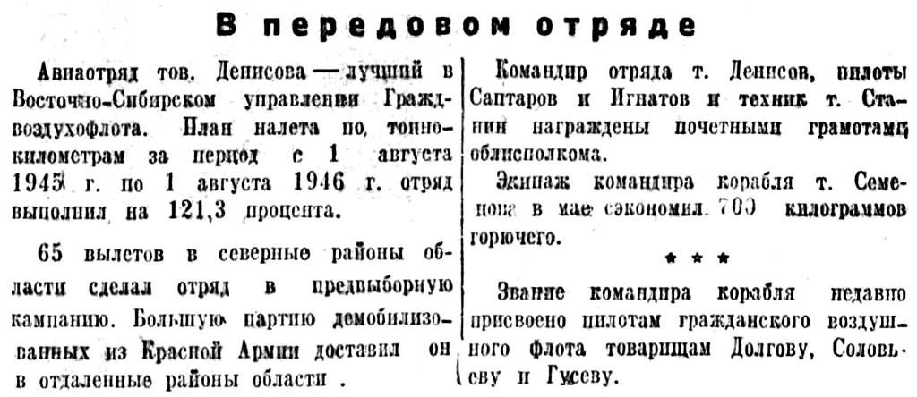 Авиаотряд тов. Денисова — лучший в Восточно-Сибирском управлении Граждвоздухофлота. План налета по тоннокилометрам за период с 1 августа 1945 г. по 1 августа 1946 г. отряд выполнил на 121,3 процента.