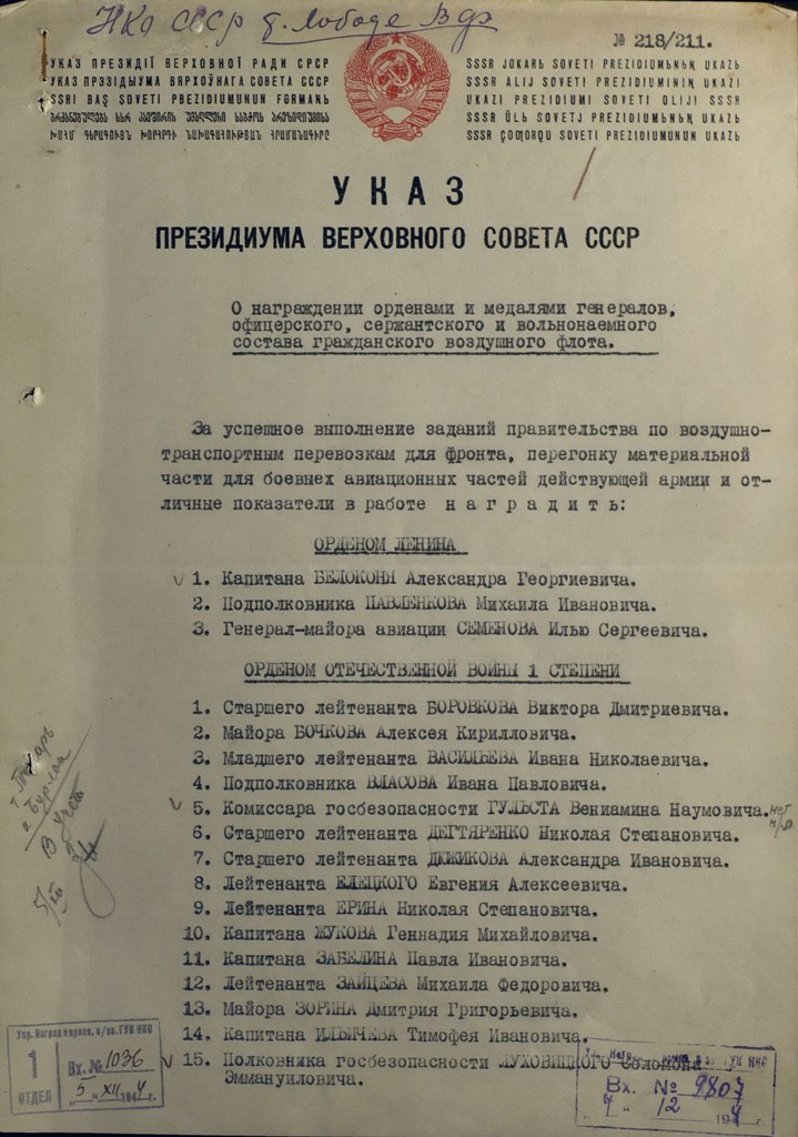 Пилот т. Беляков, бортмеханик т. Шергин награждены орденами Союза ССР. В отряде имеется 16 человек, на груди у которых значок «Отличник аэрофлота», 10 человек из них награждены за навигацию 1939 года. Среди отличников аэрофлота — такие замечательные пилоты, как тт. Эверсков, Лаптев, старший пилот отряда тов. Карпушенко, молодые пилоты отряда тт. Филановский, Гуляев, опытные бортмеханики тт. Кульков, Мясоедов, Чекрыжов, Карцев и другие.