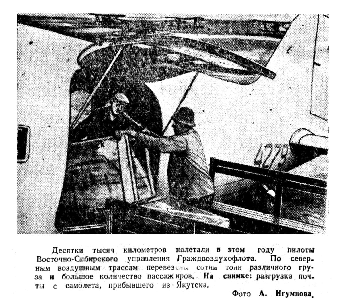 Десятки тысяч километров налетали в этом году пилоты Восточно-Сибирского управления Граждвоздухофлота. По северным воздушным трассам перевезены сотни тонн различного груза и большое количество пассажиров. На снимке: разгрузка почты с самолета, прибывшего из Якутска.