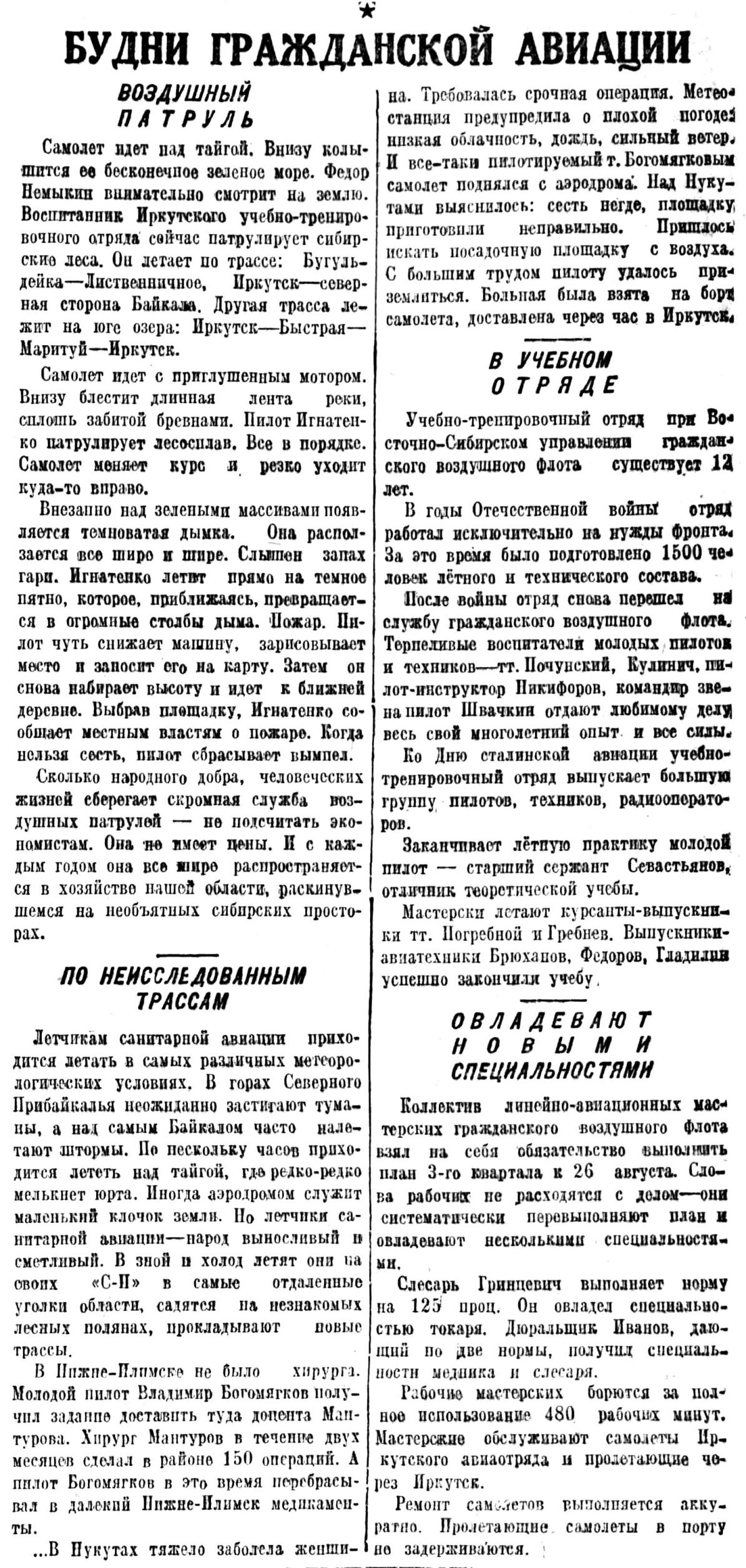 Широко развернув социалистическое соревнование среди личного состава, большинство подразделений воздушного транспорта Восточной Сибири планы первого года послевоенной сталинской пятилетки выполнило и перевыполнило. Коллектив авиаотряда тяжелых воздушных кораблей годовой план по налету часов выполнил на 113.3 и по тоннокилометрам — на 112,9 процента. Еще более высоких показателей добился авиаотряд самолетов легкого типа, выполнивший годовой план по налету часов на 121,2 и по тоннокилометрам — на 127,7 процента. Иркутский аэропорт годовой план по перевозке пассажиров выполнил на 110,5, до перевозке почты — на 197,3 и грузов — на 138 процентов.