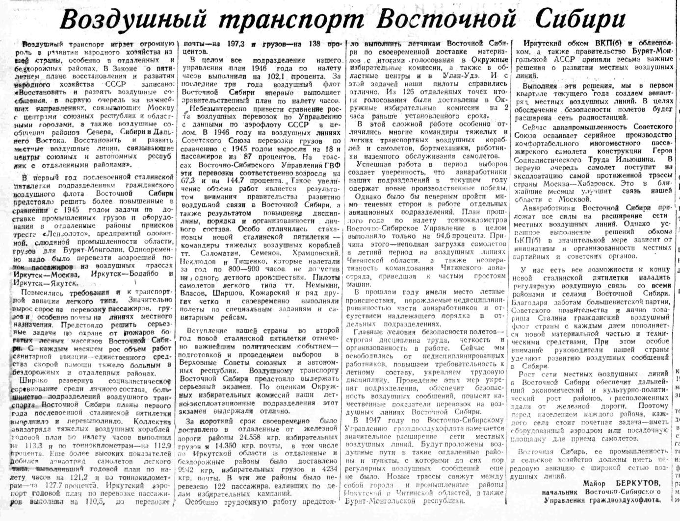 В 1947 году по Восточно-Сибирскому Управлению Граждвоздухофлота намечается значительное расширение сети местных воздушных линий. Будут проложены воздушные пути в такие отдаленные районы и пункты, с которыми до сих пор регулярных воздушных сообщений еще не было. Новые трассы свяжут между собой города и промышленные районы Иркутской и Читинской областей, а также Бурят-Монгольской республики.