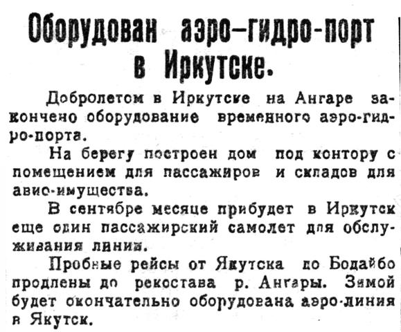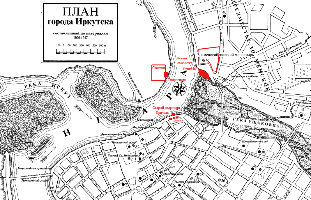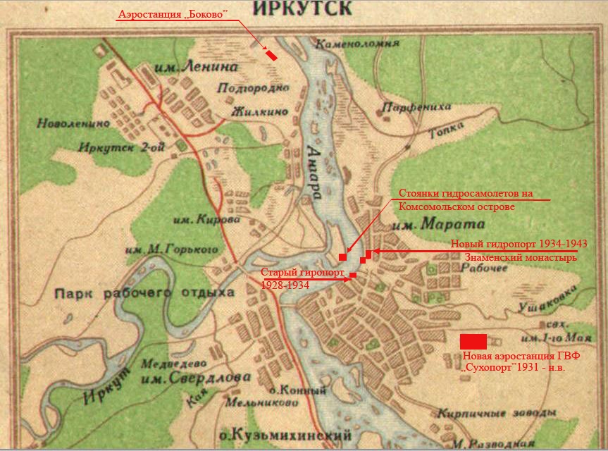Иркутский гидропорт находился в районе устья Ушаковки у Знаменского монастыря. Место было выбрано исключительно удобное: до железнодорожных путей всего полтора километра, до городской пристани — 300 метров. Там же вплоть до 1953 года размещались ангар на восемь самолетов и ремонтные мастерские на два самолета. Воздушную линию обслуживало общество "Добролет", использовавшее главным образом иностранные летательные аппараты. С середины 1930–х годов летчики стали летать на отечественных самолетах.
