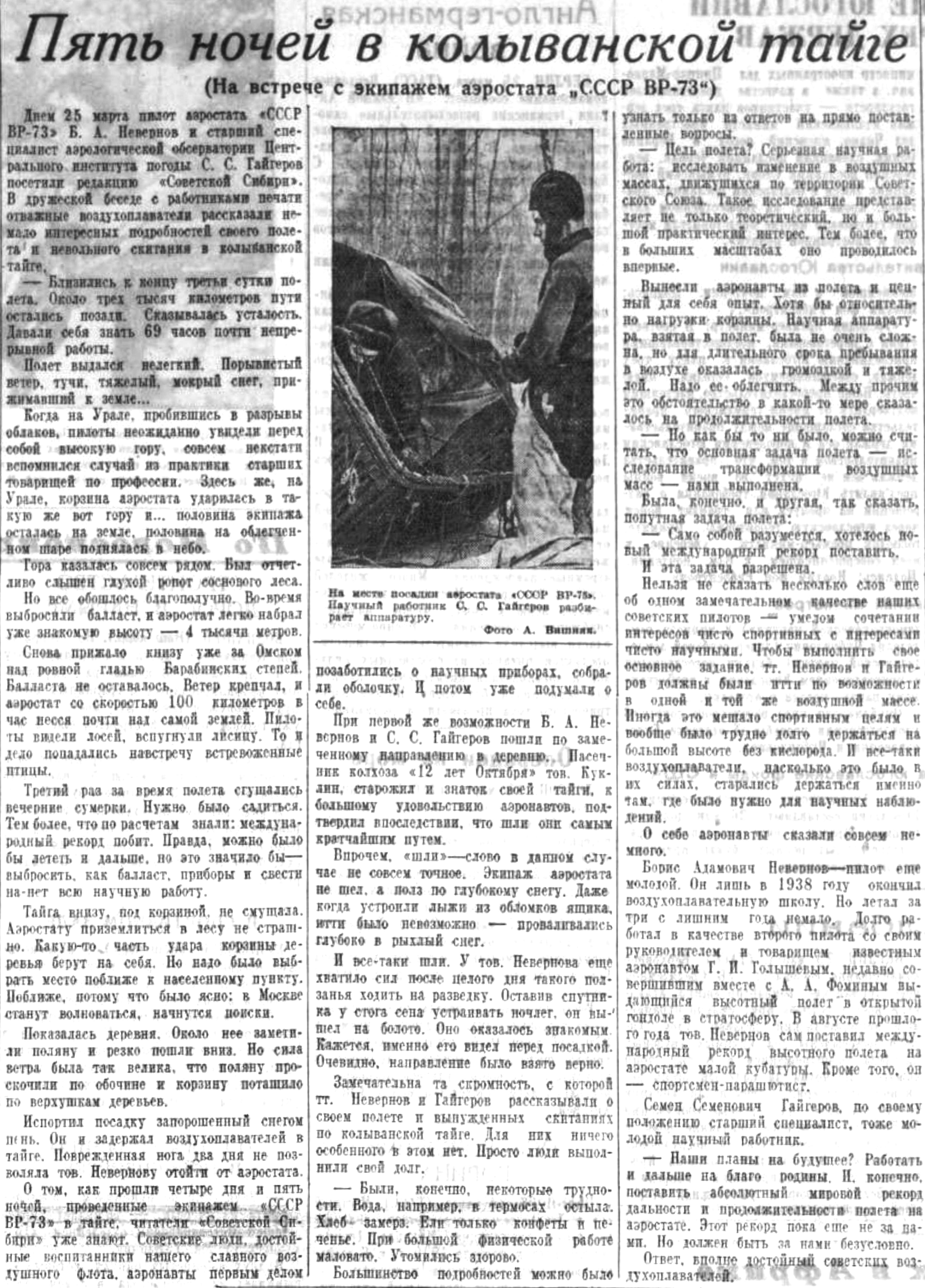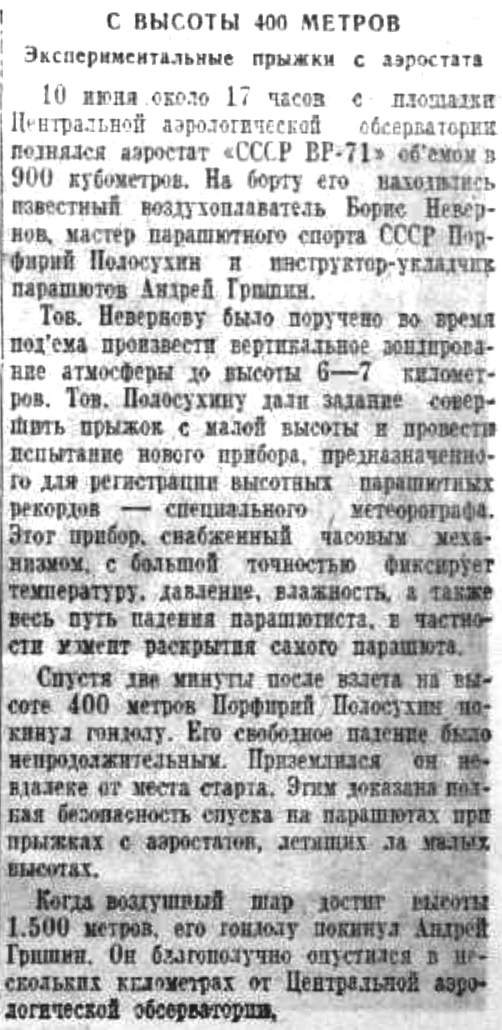 17 января командир воздухоплавательной группы аэрологической обсерватории Главного управления гидрометеорологической службы СССР известный стратонавт Фомин и старший пилот Голышев совершили выдающийся полет на субстратостате «СССР ВР-79» объемом более 2. 500 кубометров. В открытой гондоле, представляющей корзину, сплетенную из ивовых прутьев, они поднялись на высоту свыше 11.000 метров.