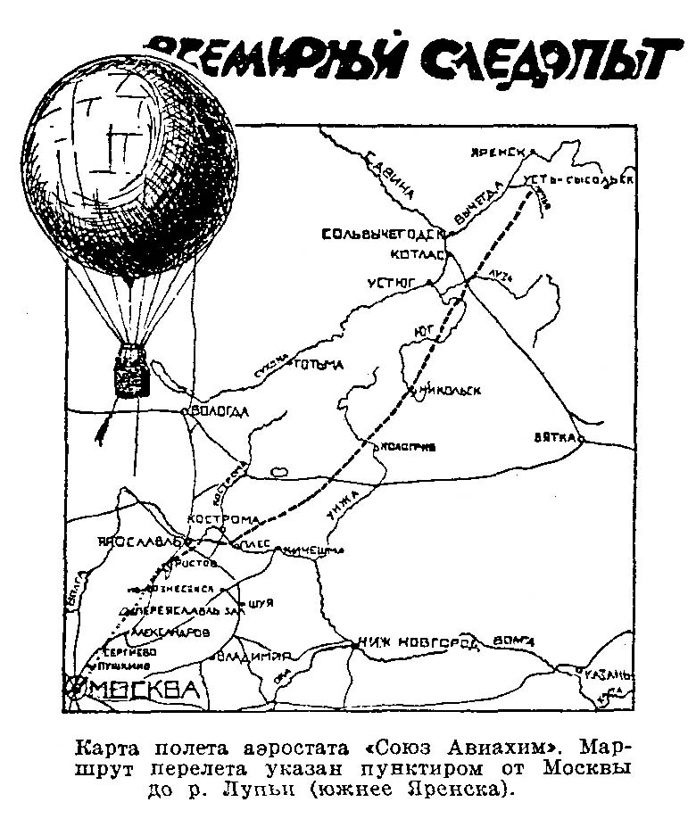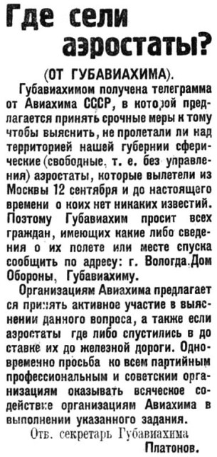 Губавиахимом получена телеграмма от Авиахима СССР, в которой предлагается принять срочные меры к тому чтобы выяснить, не пролетали ли над территорией нашей губернии сферические (свободные, т. е. без управления) аэростаты, которые вылетели из Москвы 12 сентября и до настоящего времени о коих нет никаких известий. Поэтому Губавиахим просит всех граждан, имеющих какие либо сведения о их полете или месте спуска сообщить по адресу: г. Вологда. Дом Обороны. Губавиахиму.