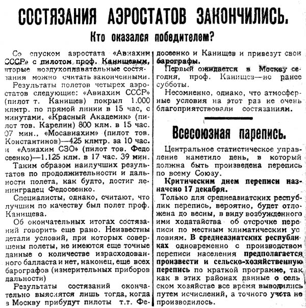 Результаты полетов четырех аэростатов следующие: «Авиахим СССР» (пилот т. Канищев) покрыл 1. 000 клмтр. по прямой линии в 15 час, с минутами, «Красный Академик» (пилот тов. Карелин) 800 клм. в 15 час. 07 мин., «Мосавиахим» (пилот тов. Константинов) — 425 клмтр. за 10 час. и «Авиахим СЗО» (пилот тов. Федосеенко) — 1. 125 клм. в 17 час. 39 мин.