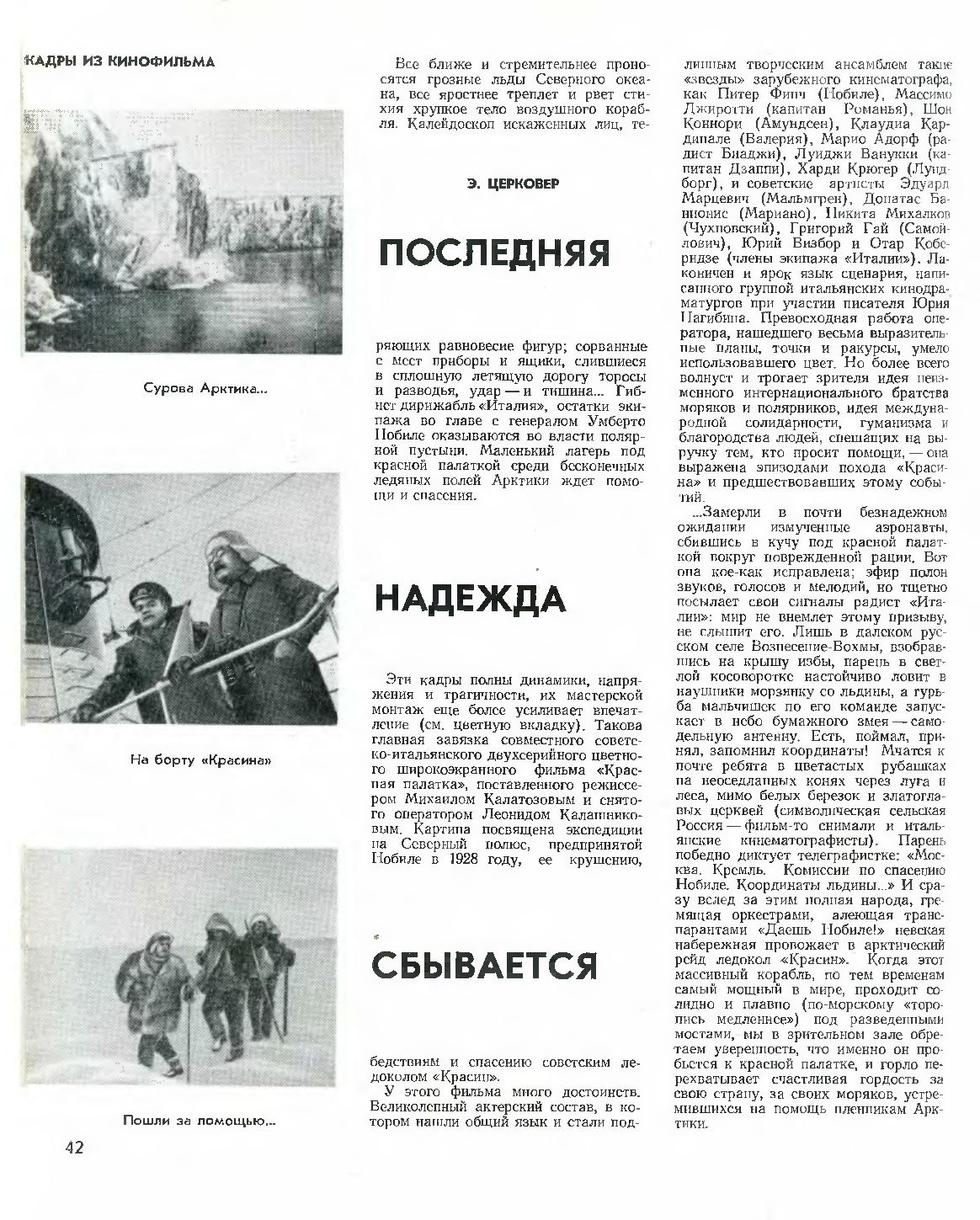 Мы отправляемся в Арктику, в район Земли Франца-Иосифа, для проведения киносъемок фильма «Красная палатка», совместное итало-советское производство. Постановщик — Михаил Калатозов, режиссер — Игорь Петров, оператор — Леонид Калашников, актеры: Отар Коберидзе (Чечони), Данатас Банионис (Мариано), Юрий Соломин (Трояни), Григорий Гай (Самойлович), Борис Хмельницкий (Вильери), Эдуард Марцевич (Мальмгрен), Никита Михалков (Чухновский), Юрий Визбор (Бегоунек) — все СССР. Луиджи Ваннукки (Дзаппи) — Италия. Другие иностранные актеры по различным причинам не смогли поехать в Арктику. Для обеспечения безопасности при работах на льду студия пригласила в экспедицию шестерых альпинистов, мастеров спорта; Владимира Кавуненко (глава фирмы), Владимира Безлюдного, Вадима Кочне-ва, Бориса Левина, Аркадия Мартыновского и спортсмена-разрядника Владимира Кулагу. Кроме того, в экспедицию были приглашены: флаг-штурман полярной авиации СССР Валентин Аккуратов, экипаж вертолета Ми-4 во главе с заслуженным летчиком-испытателем СССР Василием Колошенко, гидролог Милешко, врач-хирург Емельянов и врач-стоматолог Шамфаров, специальный охотник на медведей для охраны экспедиции Петров, два переводчика, водители автомобилей, водители вездеходов, катерники, специалисты по взрывам, дирижаблестроители, подводники-аквалангисты, инженер по технике безопасности, радист с малогабаритными радиостанциями. Директор картины — Владимир Марон.