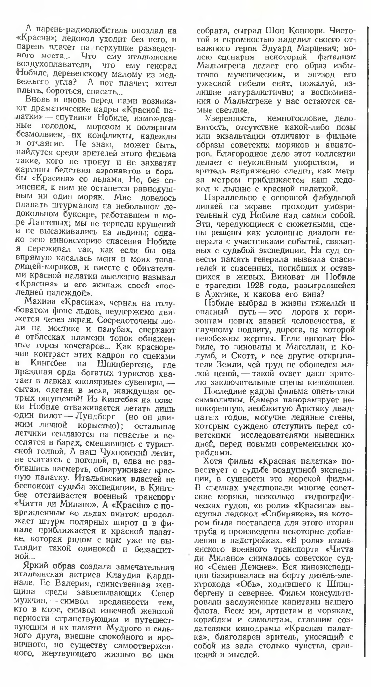 Ну, вот так началась наша работа над этим фильмом. Самое интересно для меня, как журналиста, на съемках этой картины было то, что картина эта снималась во многих очень интересных местах. Она снималась в Москве, в Ленинграде, на острове Врангеля, на Шпицбергене, в поселке Явале Сунд, в Риме, в Неаполе. И одна из самых интересных и прекрасных экспедиций была на Землю Франца-Иосифа. Специально для этой экспедиции были снаряжены, зафрахтованы, говоря по-морскому, два корабля — дизель-электроход «Обь» и ледокол «Сибиряков», который должен был играть роль ледокола «Красин». «Красин» сам уже пошел давно на ножи и вилки, а «Сибиряков» должен был исполнять его роль. Специально для экспедиции. Надо сказать, что во время съемок этой картины было истрачено гораздо больше денег, чем за саму собственно экспедицию Нобиле в двадцать восьмом году.