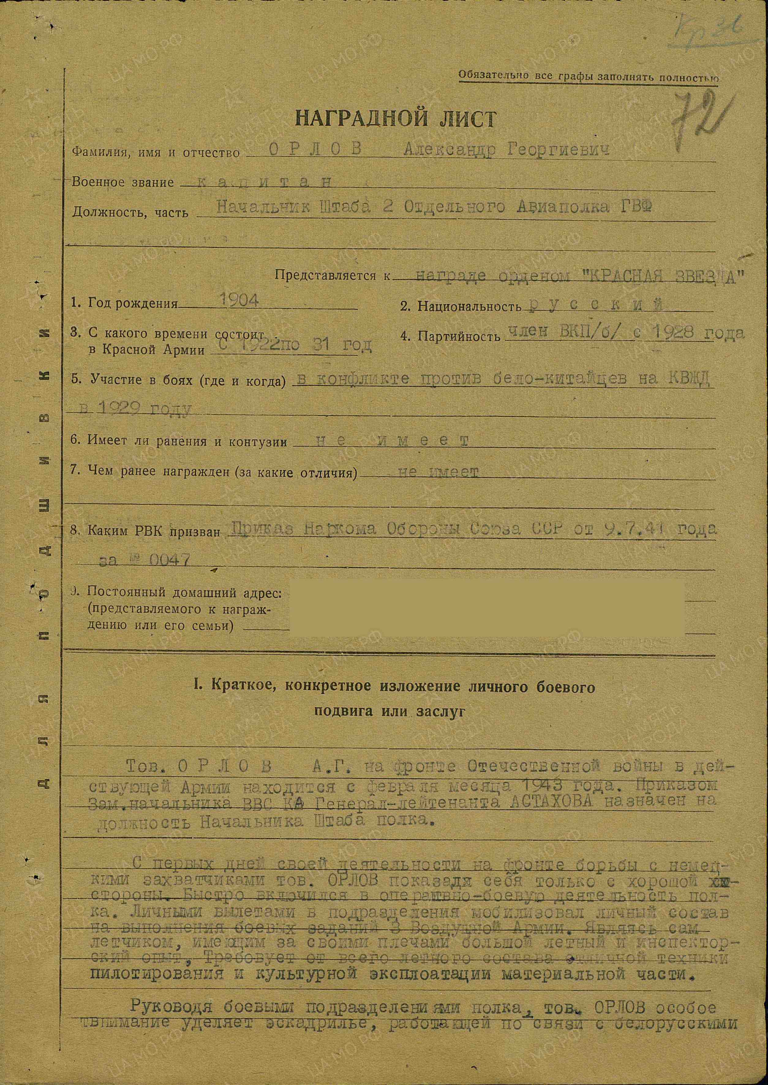 Орлов Александр Георгиевич (30.04.1904 г. рожд.) – майор.