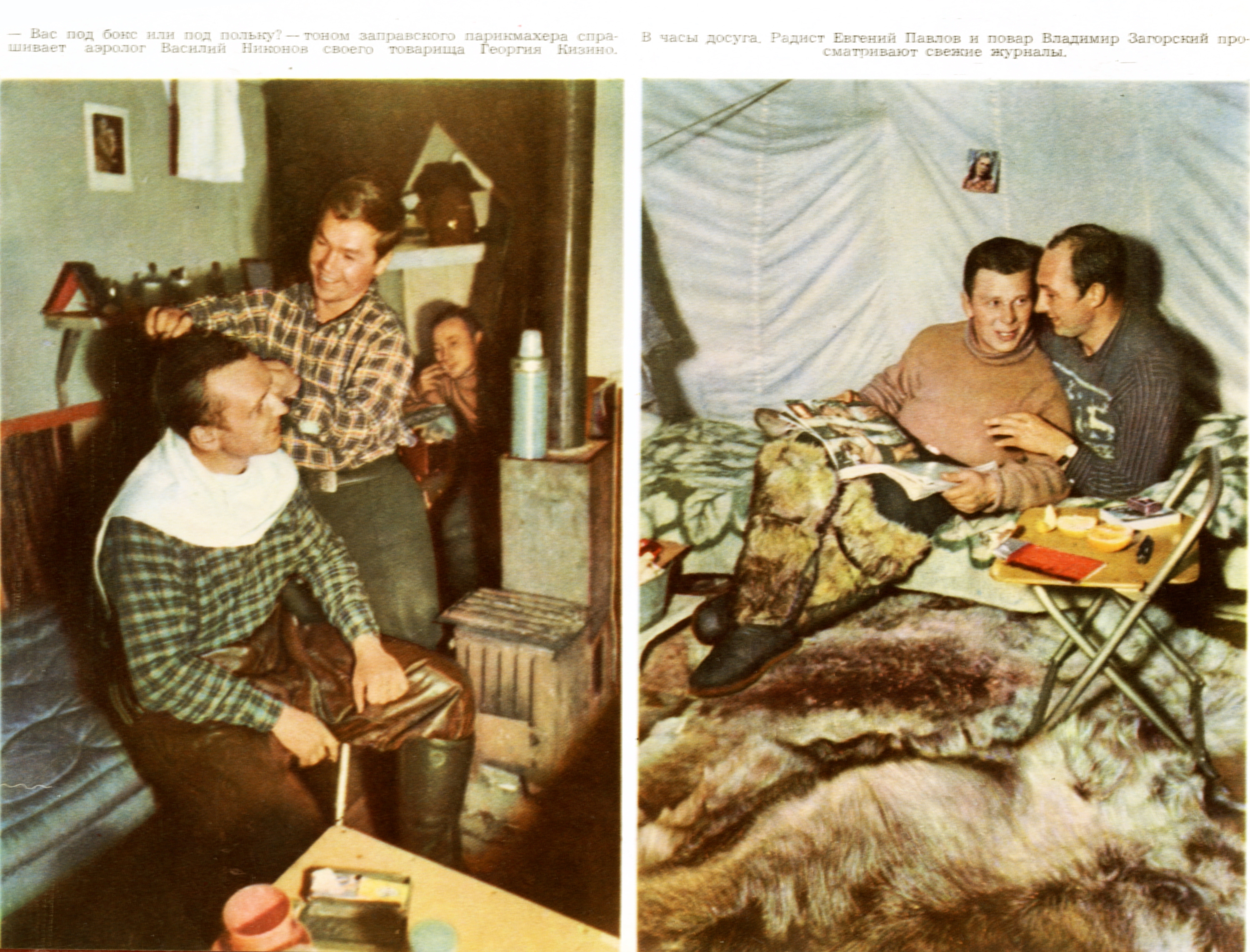 ...«Самолет подруливает к стоянке, и из него выходит Михаил Николаевич Каминский. Отворачиваясь от резкого, пронизывающего ветра, он докладывает, что в самолете имеется груз, боящийся мороза. Подоспевшие полярники выгружают на розвальни ящики с фруктами и овощами, пакеты и свертки с почтой и мешки с праздничными подарками, посылки и приборы. Трактор тянет тяжело нагруженные сани в лагерь, а самолет улетает обратно за новым грузом»...