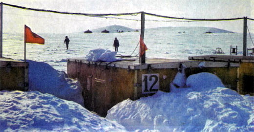 На «подскоке» разметили транспарантами и флажками взлетно-посадочную полосу для приема Ила. Размеры ее соответствовали допустимому минимуму, а толщина льда была даже с некоторым запасом. Пятеро ребят из зимовочного состава, перевезенные сюда с «СП-25» на Ан-2, вместе с группой руководителя полетов поставили юрту «Север» и две каркасные палатки. В первой, холодной, поместили движок, вырабатывающий электроэнергию для радиостанции, а во второй установили, как и в юрте, соляровую печку, поставили раскладушки для тех, кто будет заниматься разгрузочно-погрузочными работами, то есть для инженеров-грузчиков, как говорят в Арктике, среди которых, кстати, иногда можно встретить и кандидатов, и докторов наук. Ведь в Арктике все приходится делать самим, а не только вести научные наблюдения — и грузить, и возводить научный городок, и монтировать оборудование, и готовить пищу, строить и поддерживать в рабочем состоянии взлетно-посадочную полосу и многое другое.