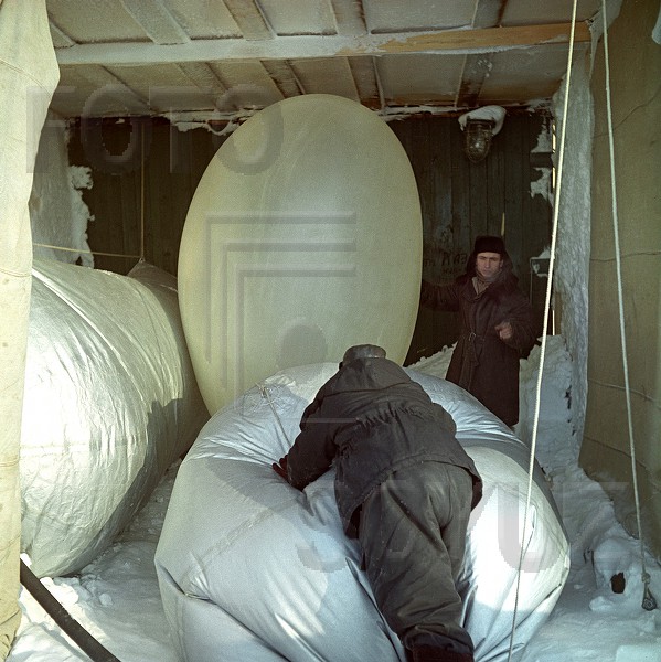 Арктика. Дрейфующая полярная станция "Северный Полюс-10". Ангар аэрологов. Наполнение водородом радиозонда перед запуском