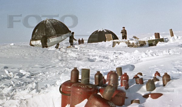 Арктика. Ледовый аэродром. Дрейфующая станция "Северный полюс-10". Перебазирование палаток
