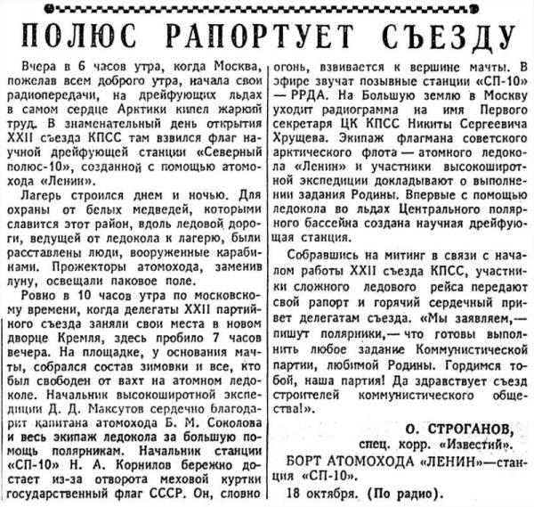 Вчера в 6 часов утра, когда Москва, пожелав всем доброго утра, качала свои радиопередачи, на дрейфующих льдах в самом сердце Арктики кипел жаркий труд. В знаменательный день открытия XXII съезда КПСС там взвился флаг научной дрейфующей станции «Северный полюс-10», созданной с помощью атомохода «Ленин».