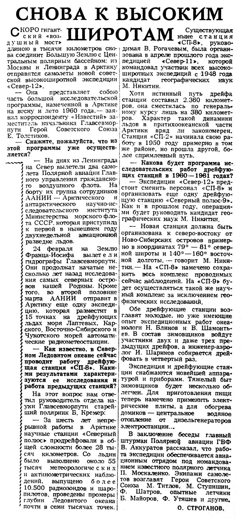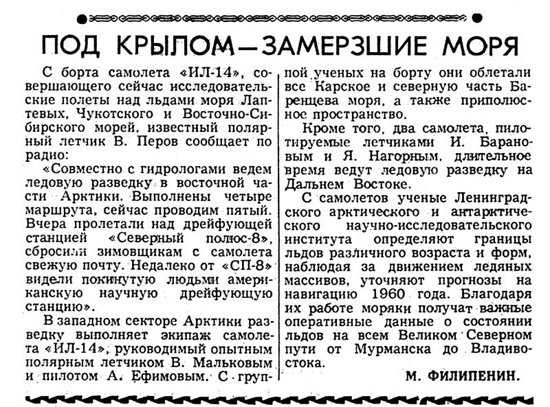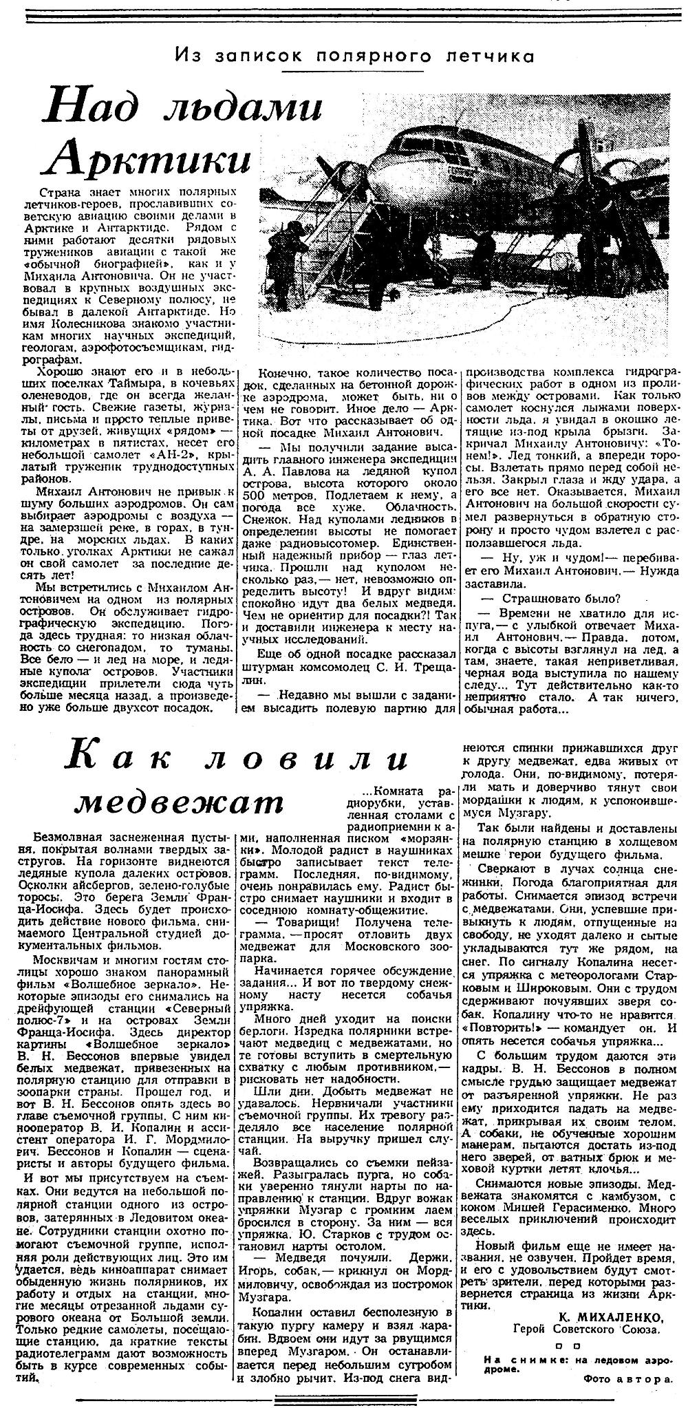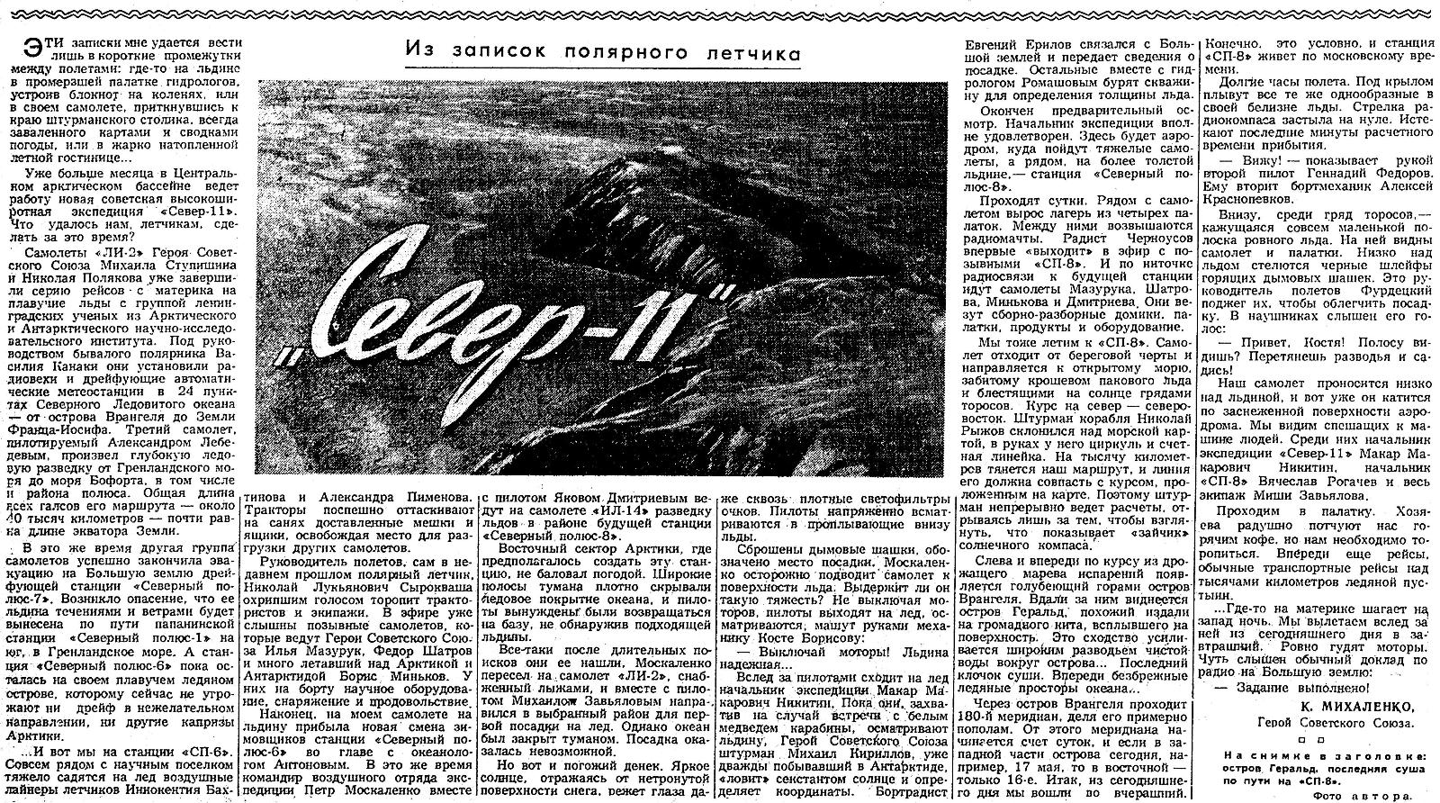 Самолеты «ЛИ-2» Героя Советского Союза Михаила Ступишина и Николая Полякова уже завершили серию рейсов - с материка на плавучие льды с группой ленинградских ученых из Арктического и Антарктического научно-исследовательского института. Под руководством бывалого полярника Василия Канаки они установили радиовеки и дрейфующие автоматические метеостанции в 24 пунктах Северного Ледовитого океана — от острова Врангеля до Земли Франца-Иосифа. Третий самолет, пилотируемый Александром Лебедевым, произвел глубокую ледовую разведку от Гренландского моря до моря Бофорта, в том числе и района полюса. Общая длина всех галсов его маршрута — около 40 тысяч километров — почти равна длине экватора Земли.
