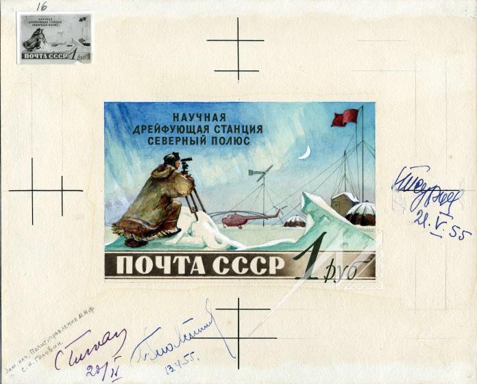 Иллюстрация: Оригинал почтовой марки, утвержденный. СССР. 1955. Научная дрейфующая станция "Северный полюс". Наблюдения за природой на станции. 1 руб. Автор: Рубан И.П. // «Центральный музей связи имени А. С. Попова» http://www.di-imagetel.ru/catalog/detail.php?ID=
