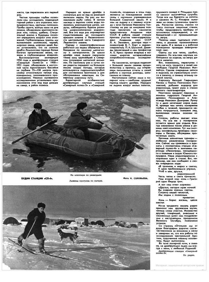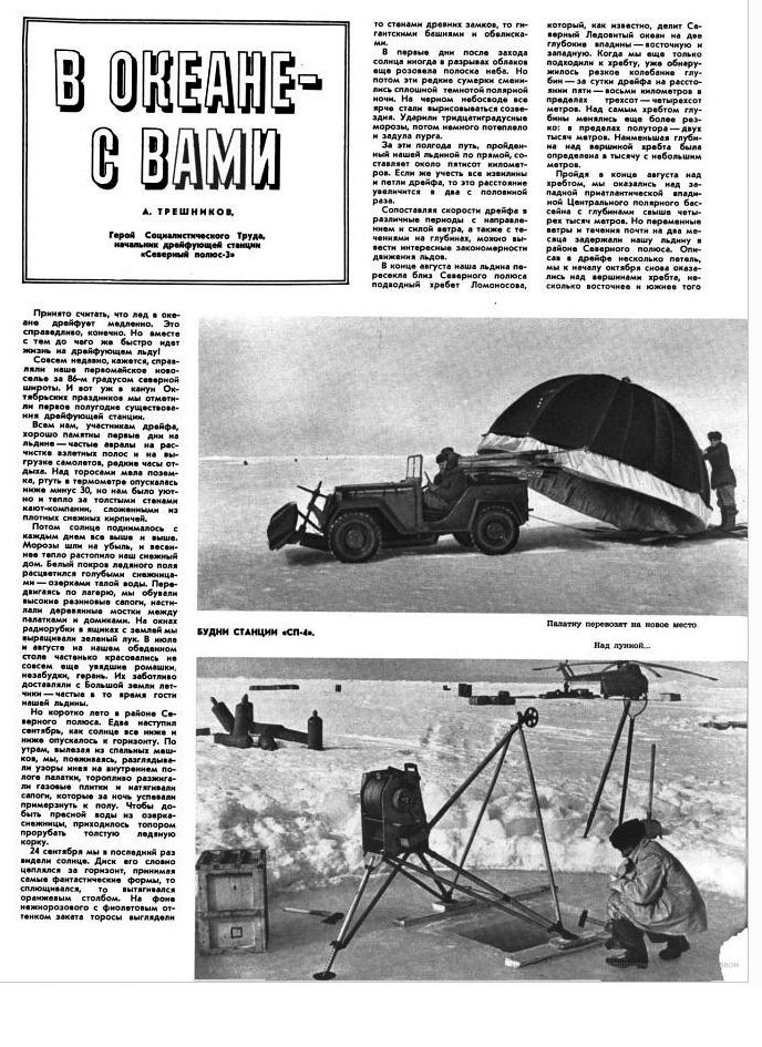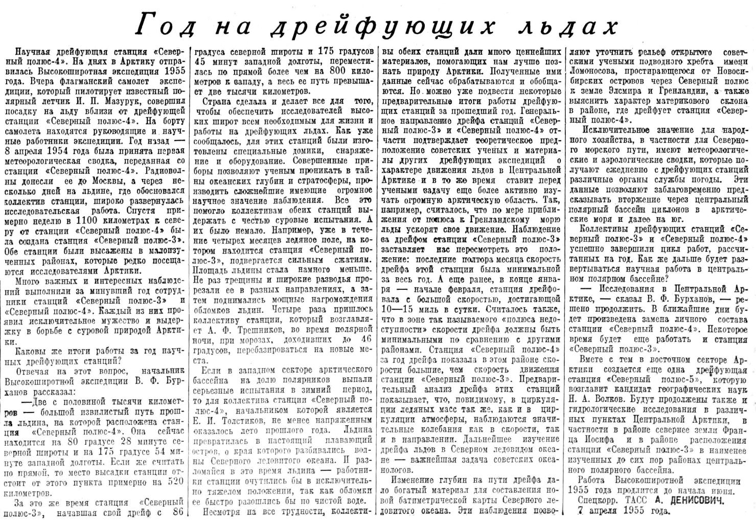 Научная дрейфующая станция «Северный полюс-4». На днях в Арктику отправилась Высокоширотная экспедиция 1955 года. Вчера флагманский самолет экспедиции, который пилотирует известный полярный летчик И. П. Мазурук, совершил посадку на льду вблизи от дрейфующей станции «Северный полюс-4». На борту самолета находятся руководящие и научные работники экспедиции. Год назад — 8 апреля 1954 года была принята первая метеорологическая сводка, переданная со станции «Северный полюс-4». Радиоволны донесли ее до Москвы, а через несколько дней на льдине, где обосновался коллектив станции, широко развернулась исследовательская работа. Спустя примерно неделю в 1100 километрах к северу от станции «Северный полюс-4» была создана станция «Северный полюс-3». Обе станции были высажены в малоизученных районах, которые редко посещаются исследователями Арктики.