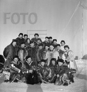 Научно-исследовательская дрейфующая полярная станция "Северный полюс-3" (СП-3). Участники экспедиции. Сидят: врач Виталий Волович (первый слева), Фотокорреспондент-кинооператор Евгений Яцун (второй слева). Апрель 1954