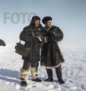 Научно-исследовательская дрейфующая полярная станция "Северный полюс-3" (СП-3). Фотограф Яков Рюмкин и фотокорреспондент-кинооператор экспедиции Евгений Яцун, создавший фильм о дрейфующей станции. Апрель 1954