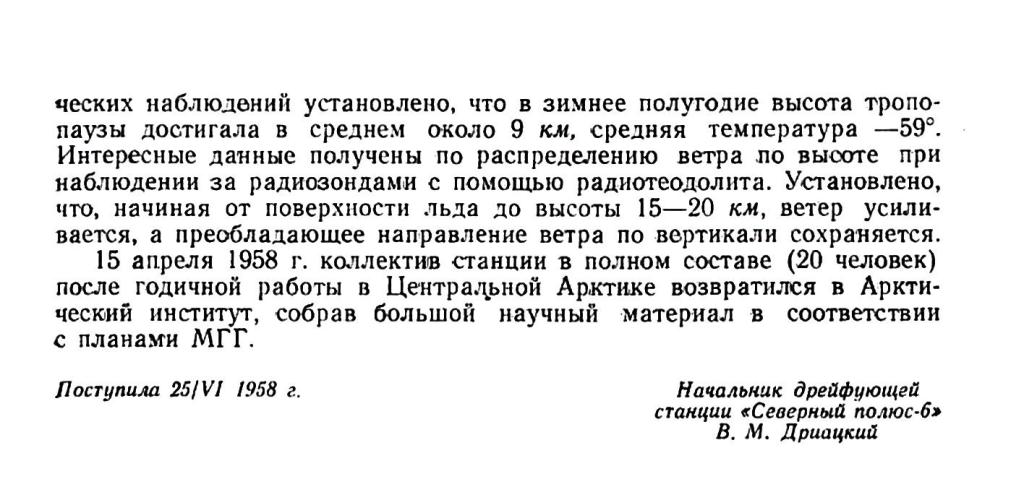 15 апреля 1958 г. коллектив станции в полном составе (20 человек) после годичной работы в Центральной Apктике возвратился в Арктический институт, собрав большой научный материал в соответствии с планами МГГ.