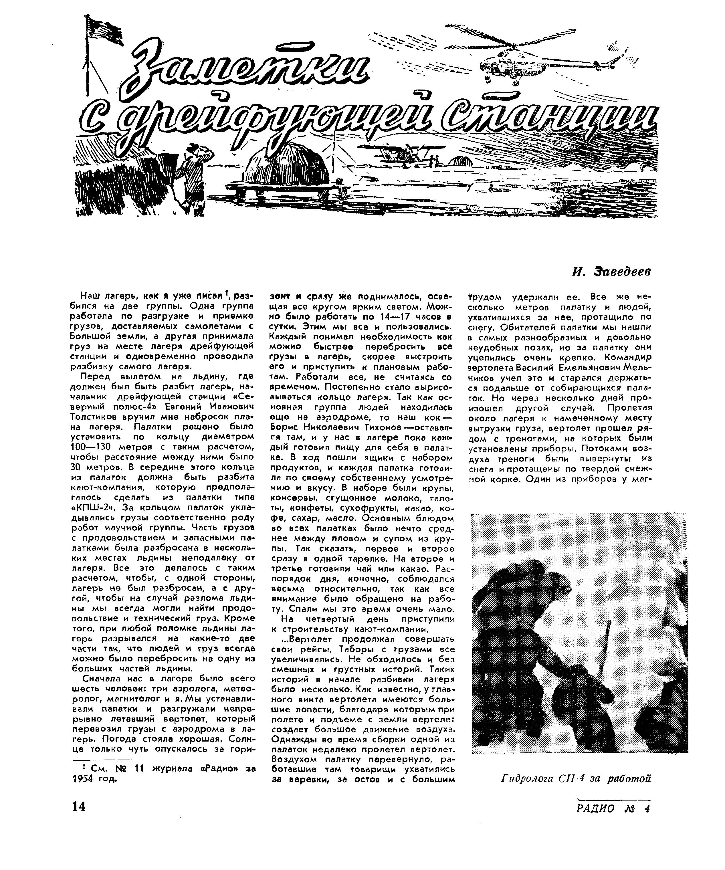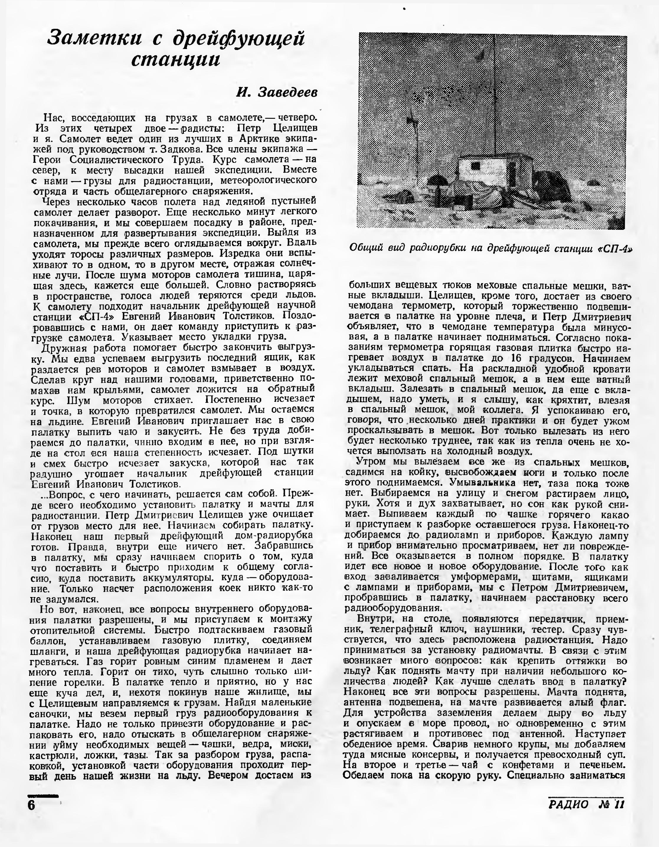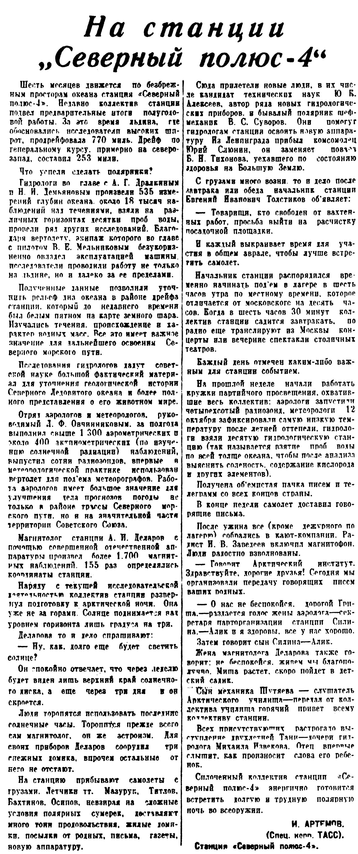 — Иногда в некоторых газетах не совсем правильно о нас пишут. С одной стороны получается, что мы вроде какие-то герои, а с другой стороны, оказывается, что люди дрейфующей станции только и делают, что распевают полярные вальсы, кушают фрукты и всякие деликатесы... Если уж обязательно нужен какой-то эпитет в применении к нашим людям, то этим эпитетом может быть только слово труженики.