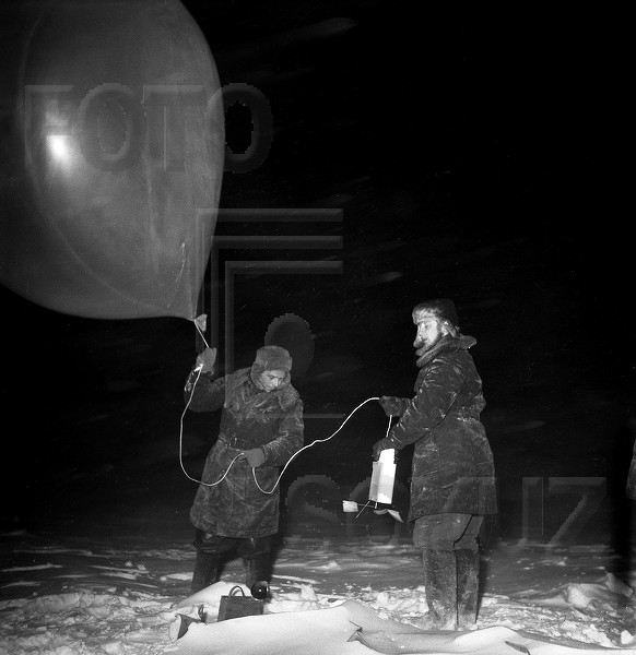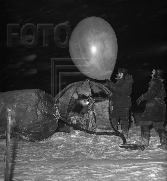 Научно-исследовательская дрейфующая полярная станция "Северный полюс-3" (СП-3). Аэрологи готовят радиозонд. Баллон из особой ткани-газгольдер наполнен водородом. Из него по резиновому шлангу газ перекачивают в оболочку зонда. Апрель 1954