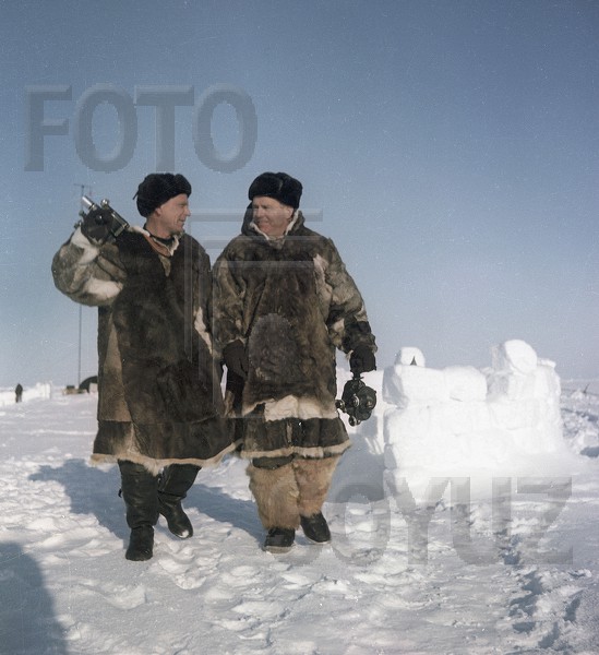 Научно-исследовательская дрейфующая полярная станция "Северный полюс-3" (СП-3). Евгений Яцун (слева) - фотокорреспондент-кинооператор экспедиции, создавший фильм о дрейфующей станции. Апрель 1954