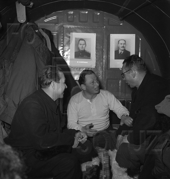 Научно-исследовательская дрейфующая полярная станция "Северный полюс-3" (СП-3). Быт. В центре - фотограф Яков Рюмкин. Апрель 1954