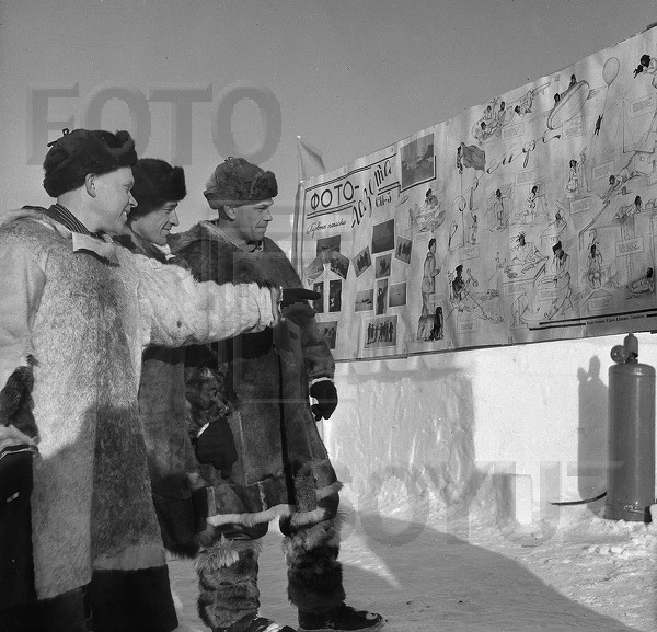Научно-исследовательская дрейфующая полярная станция "Северный полюс-3" (СП-3). У фото-газеты коллектива станции. Слева направо: гидролог Владимир Шамонтьев, научный работник ионосферист Ольгерд Змачинский и механик М.С.Комаров. Апрель 1954