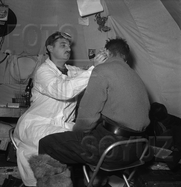 Научно-исследовательская дрейфующая полярная станция "Северный полюс-3" (СП-3). Врач Виталий Волович регулярно проводит медицинский осмотр зимовщиков. Апрель 1954