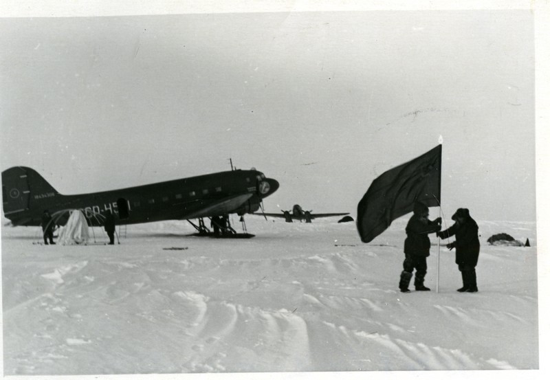 2 апреля 1954 г. И.С.Котов (инструктор в экипаже Ли-2 Н-579 А.Н.Пименова, старший штурман отряда – М.Ф.Щерпаков, бортрадист – Н.А.Богаткин, 1-й бортмеханик – А.Ф. Островенко, 2-й бортмеханик - В.Н.Ананьев) в паре с П.П.Москаленко (инструктор в экипаже Ли-2 Н-531 В.И.Васильева) вылетели и подобрали за 85-й параллелью льдину для промежуточной базы "СП-3". На снимке: Ли-2 Н-531 (на первом плане) и Ли-2 Н-579 (на дальнем плане).
