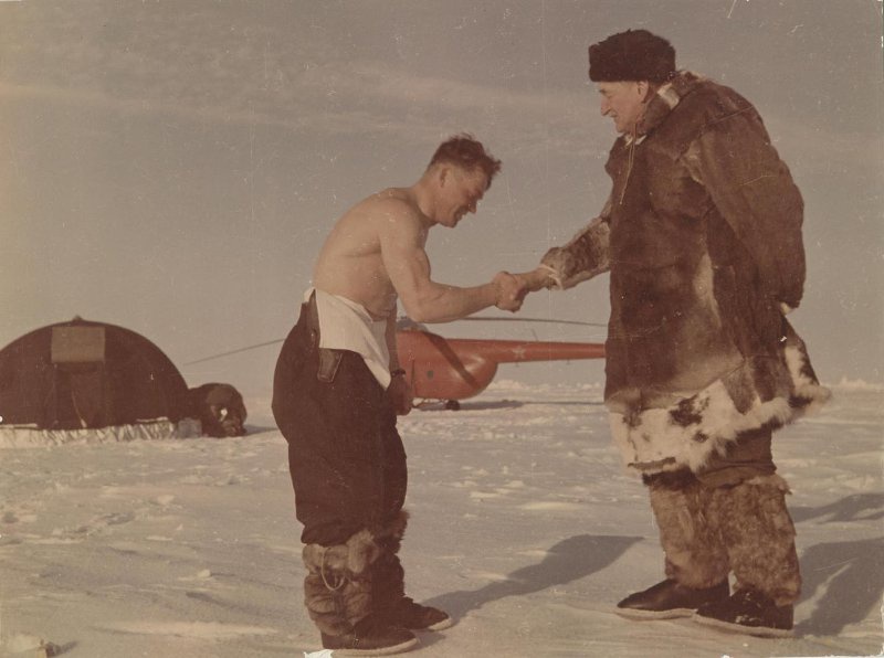 Академик Дмитрий Иванович Щербаков приветствует штурмана вертолёта Ми-4 №0207 А.Т.Минакова в лагере станции «Северный полюс-3». 1954–1955 гг. Снимок фотокора Якова Израилевича Рюмкина (1913-1986) - https://russiainphoto.ru/search/photo/y ... 81&page=12