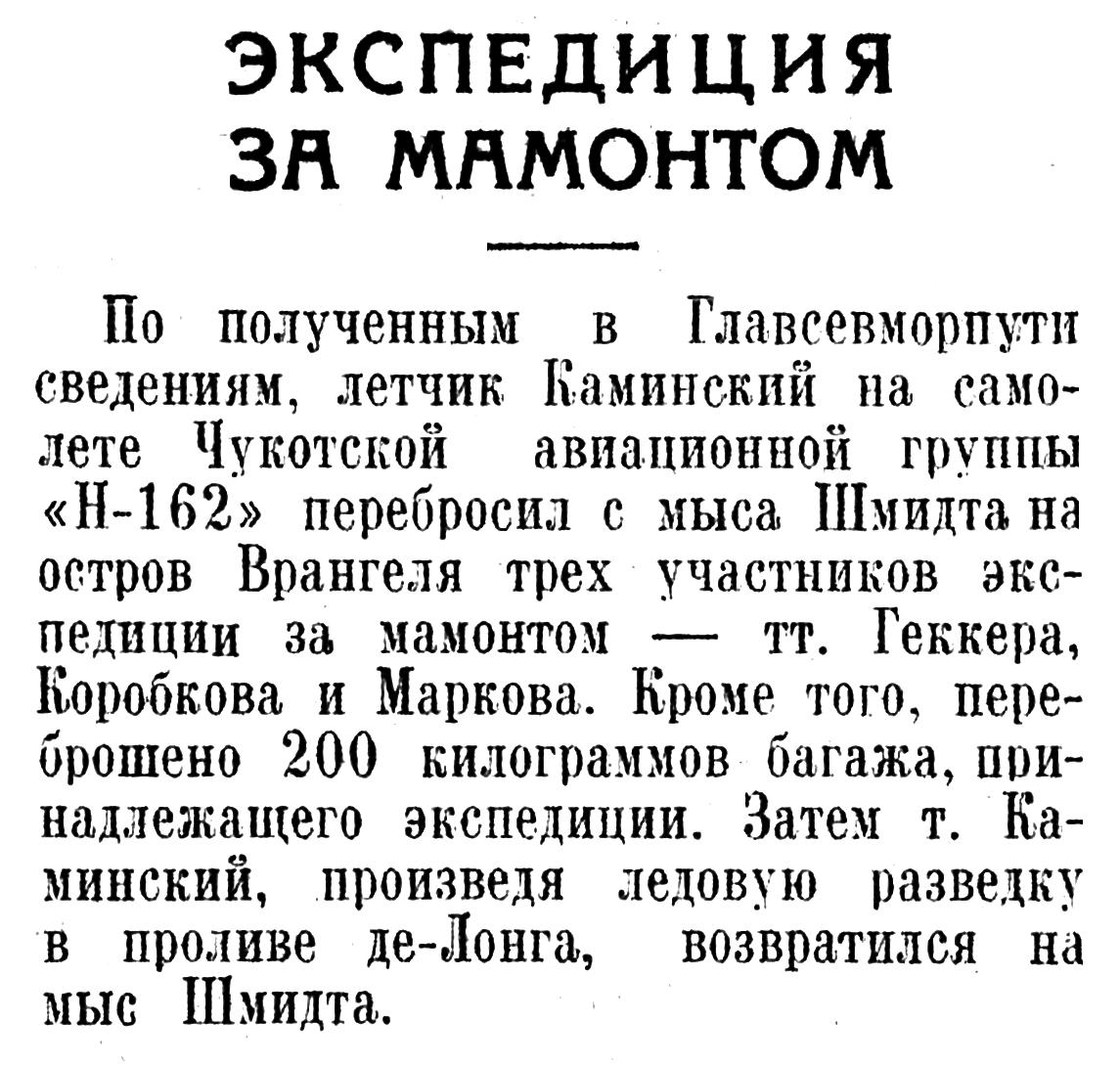 По полученным в Главсевморпути сведениям, летчик Каминский на самолете Чукотской авиационной группы «Н-162» перебросил с мыса Шмидта на остров Врангеля трех участников экспедиции за мамонтом — тт. Геккера, Коробкова и Маркова, Кроме того, переброшено 200 килограммов багажа, принадлежащего экспедиции. Затем т. Каминский, произведя ледовую разведку в проливе де-Лонга, возвратился на мыс Шмидта.