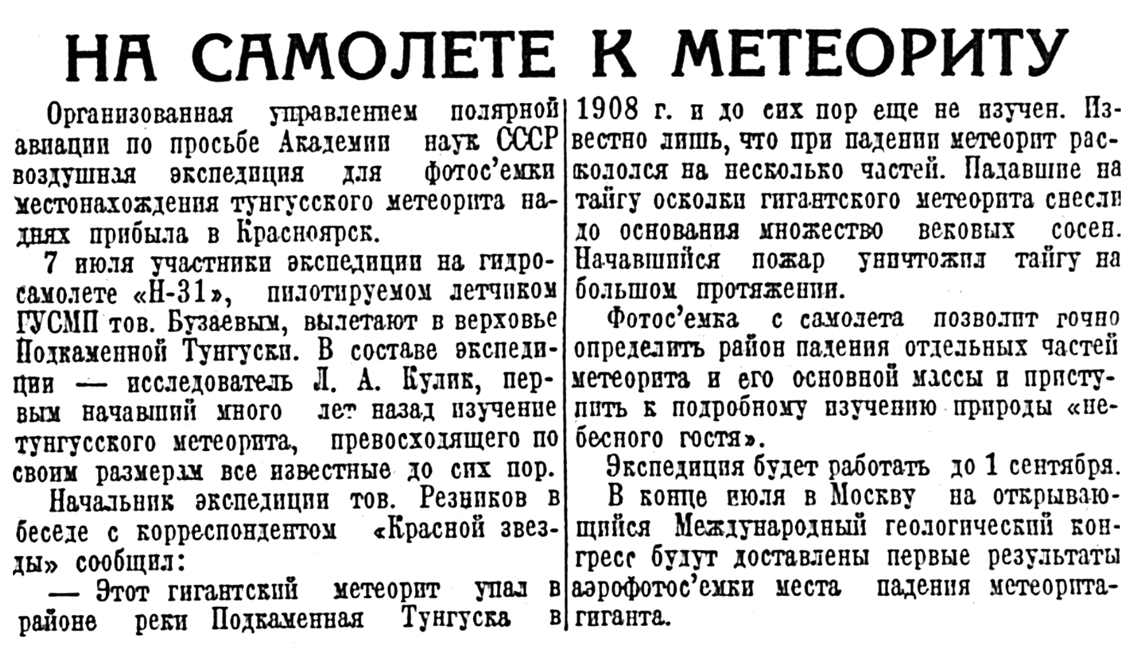7 июля участники экспедиции на гидросамолете «Н-31», пилотируемом летчиком ГУСМП тов. Бузаевым, вылетают в верховье Подкаменной Тунгуски. В составе экспедиции — исследователь Л. А. Кулик, первым начавший много лет назад изучение тунгусского метеорита, превосходящего по своим размерам все известные до сих пор.