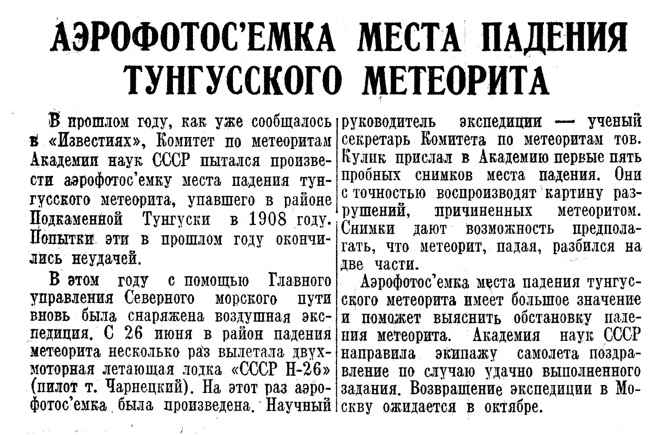 «Вечерняя Москва» в свое время сообщала об отъезде известного исследователя метеоритов Л. А. Кулика в Сибирь, в бассейн реки Подкаменной Тунгузки. Он выехал для руководства аэрофотосъемками на месте падения гигантского метеорита в 1908 году (аэрофотосъемки производились полярным управлением Главсевморпути).