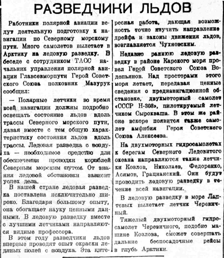 Работники полярной Авиации ведут деятельную подготовку к навигации по Северному морскому пути. Много самолетов вылетает в Арктику на ледовую разведку. В беседе с сотрудником ТАСС начальник управления полярной авиации Главсевморпути Герой Советского Союза полковник Мазурук сообщил: