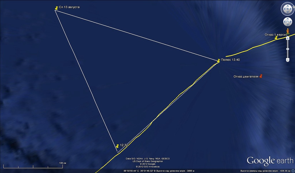 Мы тоже обнаружили на маршруте остановку второго двигателя. Что это было — отказ или сознательная остановка двигателя, выполненная экипажем для компенсации вращательных моментов в горизонтальной плоскости из-за большой разности тяговых характеристик на противоположных сторонах? По нашим оценкам, это произошло на 80-й широте, что несколько отличается от аналитических показателей: до этой точки от места остановки 4-го двигателя расстояние в 1069 км, т. е. 7,5 часа самолет летел со скоростью 143 км в час, таким образом, для тех обстоятельств полета аналитическая величина скорости несколько завышена.