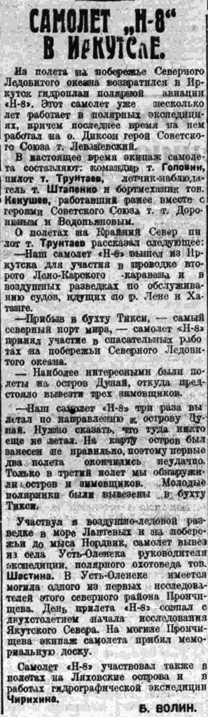 1936 г - Командир Задков В.Н. находился в Дудинке в резерве по оказанию помощи на случай вынужденной посадки при перелёте Чкалова на самолёте РД АНТ-25.