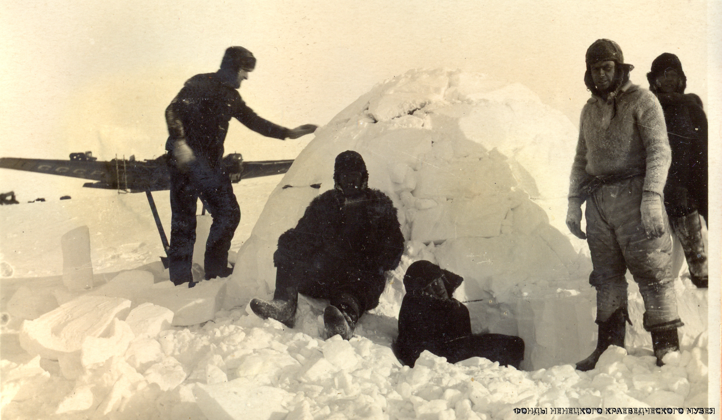 Фото из фондов Ненецкого окружного краеведческого музея (Фотоальбом Малаховского А.В.). Экипаж самолета Н-115 у снежного дома, 1938 г.