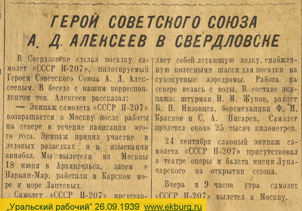 В Свердловске сделал посадку самолет «СССР Н-207», пилотируемый Героем Советского Союза А.Д.Алексеевым. в беседе с нашим корреспондентом товарищ Алексеев рассказал: - Экипаж самолета «СССР Н-207» возвращается в Москву после работы на севере в течение навигации этого года. Экипаж принял участие в ледовых разведках и в изыскании авиабаз. Мы вылетели из Москвы 18 июня в Архангельск, затем в Нарьян-Мар, работали в Карском море и море Лаптевых. 24 сентября славный экипаж самолета «СССР Н-207» прсутствовал в театре оперы и балета имени Луначарского на открытии сезона. Вчера в 9 часов утра самолет «СССР Н-207» вылетел в Москву