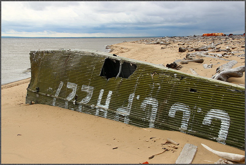 " При осмотре берега, в километре от лагеря, обнаружил, выброшенное штормом, замытое песком крыло самолета, с хорошо читаемым номером «СССР Н-227»"