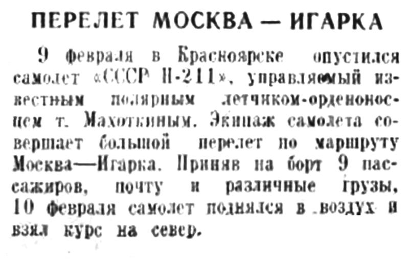 Советская Сибирь, 1940, № 035 (1940-02-12)ПЕРЕЛЕТ МОСКВА - ИГАРКА9 феврали в Красноярске опустился самолет "СССР Н-211", управляемый известным полярным летчиком-орденоносцем т. Махоткиным. Экипаж самолета совершает большой перелет по маршруту Москва—Игарка. Приняв на борт 9 пассажиров, почту и различные грузы. 10 февраля самолет поднялся в воздух и взял курс на север.