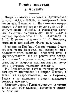 Вчера из Москвы вылетел в Архангельск самолет «СССР-Н-338», пилотируемый летчиком тов. Бахтиновым. На самолете отправилась в Арктику первая группа ученых Института общей гигиены и Института питания Академии медицинских наук СССР в составе профессоров И. А. Арнольди и В. В. Ефремова и доцента И. С. Кондрор, которая в дальнейшем будет пополнена.