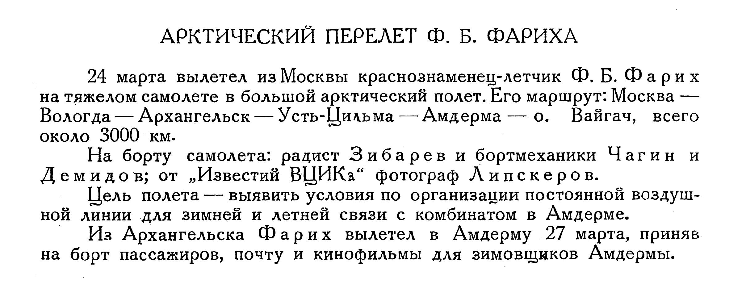 24 марта вылетел из Москвы краснознаменец-летчик Ф. Б. Фарих на тяжелом самолете в большой арктический полет. Его маршрут: Москва — Вологда — Архангельск — Усть-Цильма — Амдерма — о. Вайгач, всего около 3000 км.