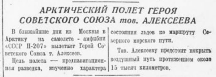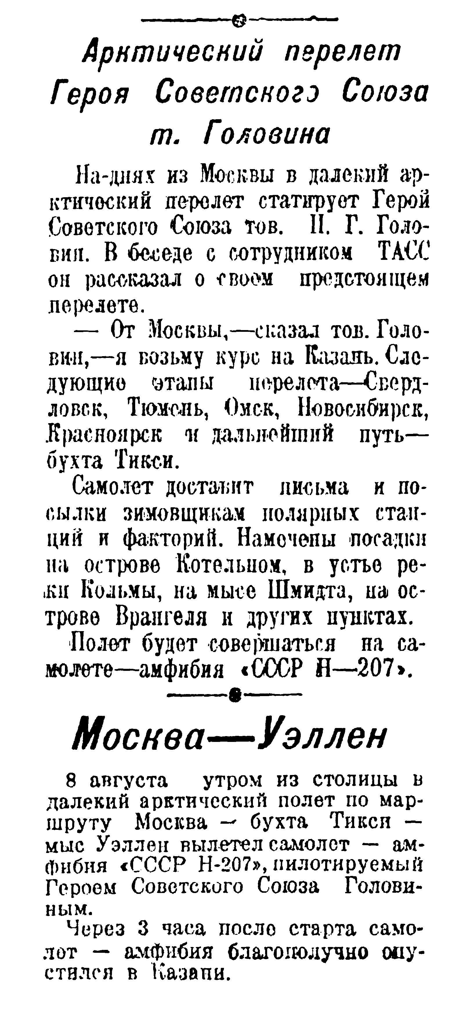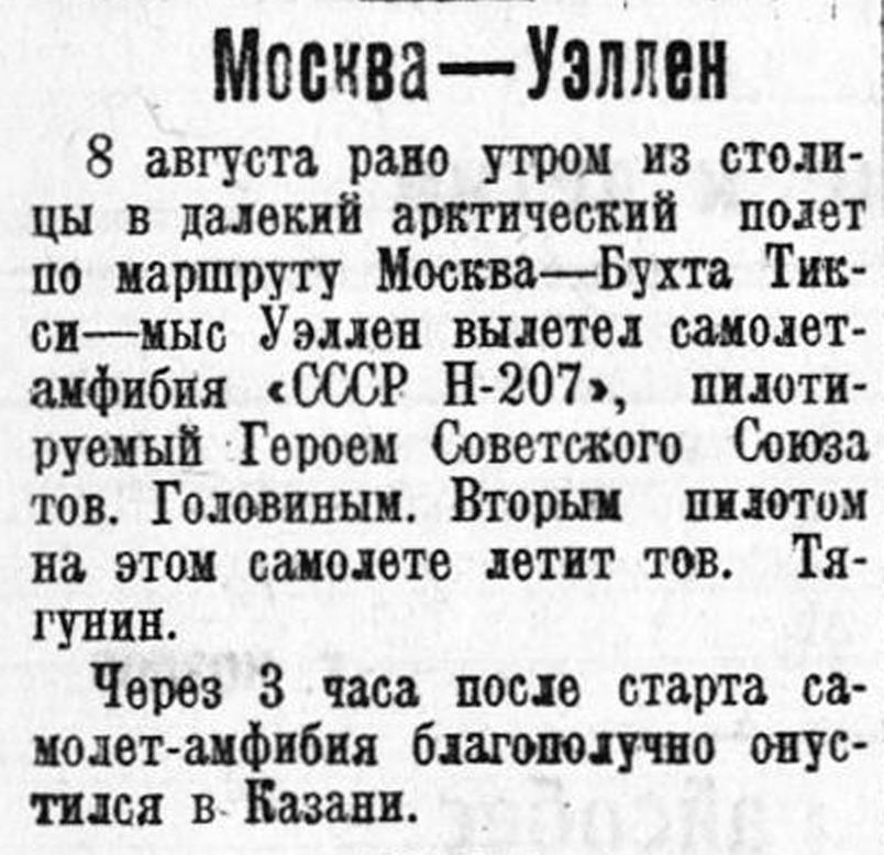 Красный Север 1938 № 183 (5763)Москва—Уэллен8 августа рано утром из столицы в далекий арктический полет по маршруту Москва—Бухта Тикси—мыс Уэллен вылетел самолет-амфибия "СССР Н-207", пилотируемый Героем Советского Союза тов. Головиным. Вторым пилотом на этом самолете летит тов. Тягунин.