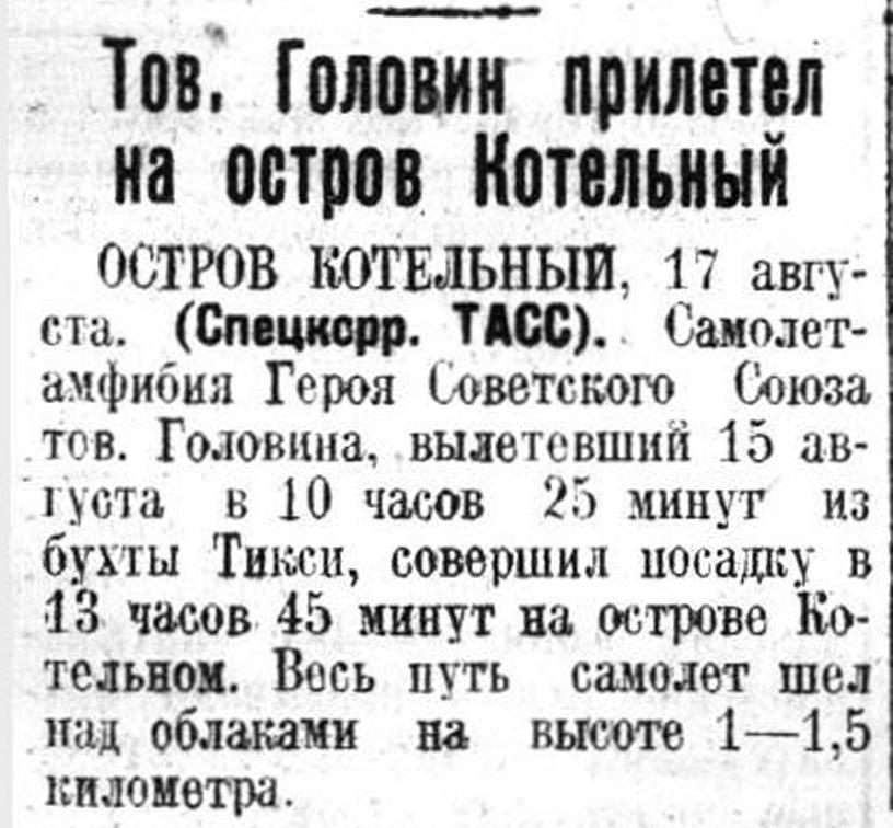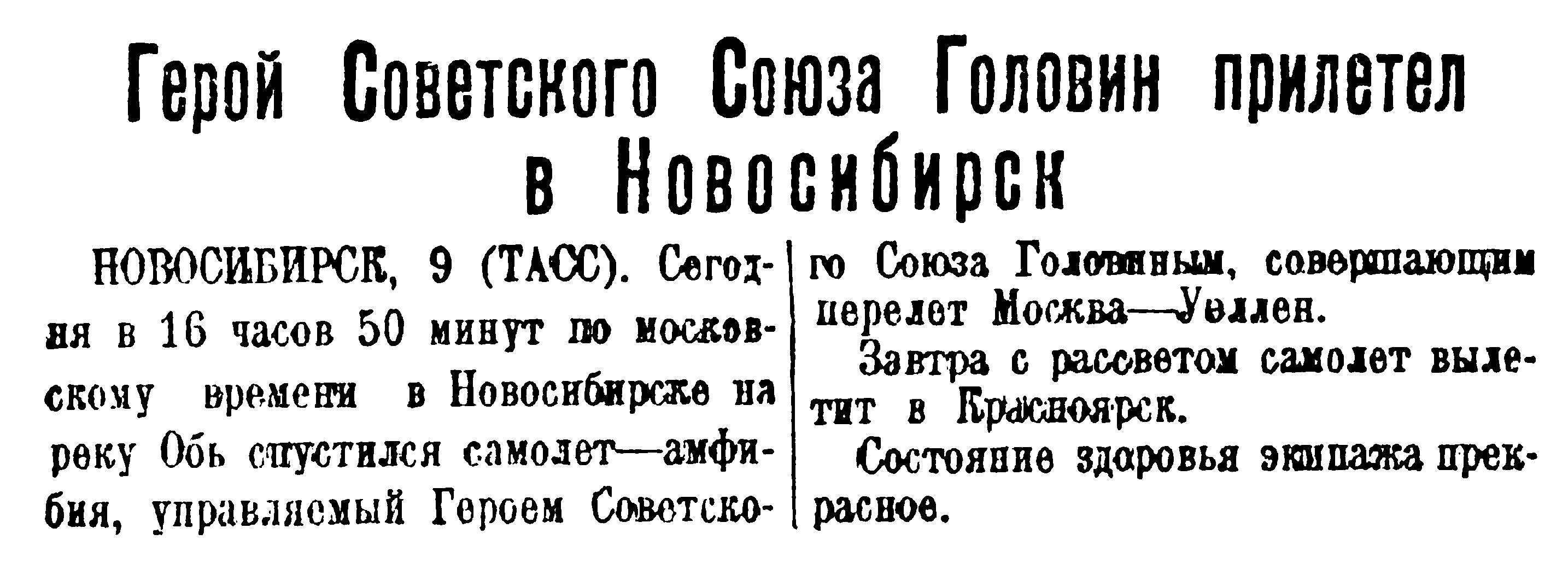 ВСП 1938 № 184 (11 авг.)Герой Советского Союза Головин прилетел в НовосибирскНОВОСИБИРСК, 9 (ТАСС). Сегодня в 16 часов 50 минут по московскому временя в Новосибирске на реку Обь опустился самолет—амфибия, управляемый Героем Советского Союза Головиным, совершающим перелет Москва—Уэллен.