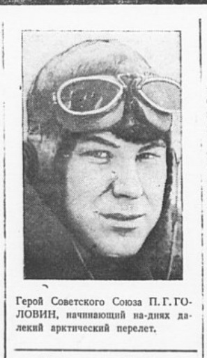 ВСП 1938 № 183 (10 августа.)Арктический перелет Героя Советского Союза т. ГоловинаНа-днях из Москвы в далекий арктический перелет стартует Герой Советского Союза тов. П. Г. Головин. В беседе с сотрудником ТАСС он рассказал о своем предстоящем перелете.
