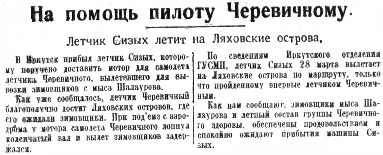 12 марта «Востсибправда» сообщала о вылете из Иркутска на мыс Шалаурова (на Ляховских островах) лётчика И. И. Черевичного для переброски зимовщиков в бухту Тикси.